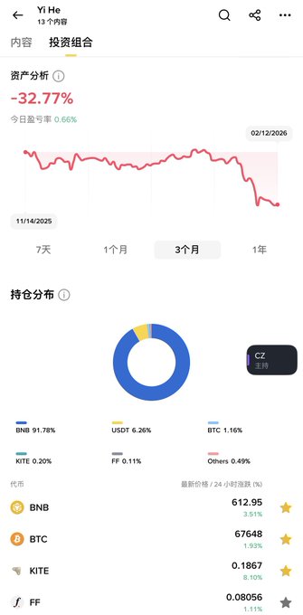 一姐的持仓公开了🤣大家之前一直很好奇,她到底会拿什么资产 看完持仓分布,其实也不意外,一姐确实是言行一致,以 #bnb 作为自己的核心资产,这种创始人强绑定本身就是一种态度。一个真正长期在做事情的创始人,往往会把自己的身家和自己所Build的公司绑在一起,我们能看到像黄仁勋、埃隆·马斯克这些世界级企业家,也都是把大部分财富放在自己公司股票上 一姐目前的持仓分布是: BNB占91.87% USDT占6.26% BTC占1.16% Kite占0.2% FF占0.11% 其他占0.49% 绝大部分资产都压在BNB上,这种仓位配置是长期选择