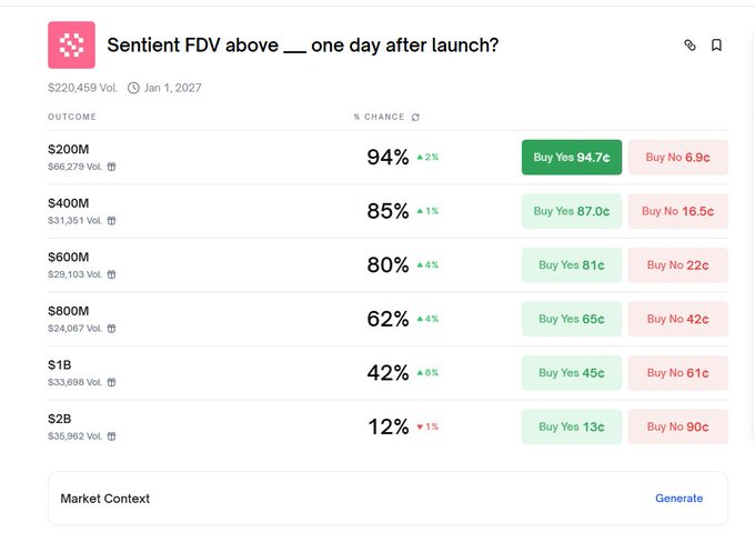 Sent这个项目今年年中喊出的预期是8-10B,参与的人是1B左右,目前盘前大概在1.8B。而Polymarket 给出的预测是200M,也就是两亿,从盘前估值和polymarket预测市场来看分歧非常大 反过来看@opinionlabsxyz ,我个人是非常看好的。目前它是BNB Chain预测市场龙头,单日收入突破30万美元,而且是一个具备自我造血能力的项目 在预测市场整体热度持续升温的背景下,Opinion反而具备出现超预期表现的暴击。毕竟在它之上的两个对标项目估值已经到了 10B级别。对比之下Opinion 当前的估值明显偏低 再看Sent所对应的AI叙事,像Surf这种已经被大量用户实际使用的大模型整体估值也就在1亿美金。综合来看Sent 给到 200M,Opinion在 1.8B 这个位置反而是更合理、也更保守的定价判断 twitter.com/EnHeng456/status/2...