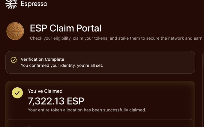 咖啡 @EspressoSys 可以领取了,果真和之前查的一样 我是创作者,而且nft持有者,各种任务做完了 最终拿了7000多个,你们拿了多少? claim.espresso.foundation/clai...
