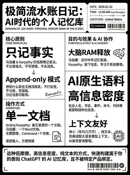 看到马伯庸分享他写日记的方式,非常有意思! 而且跟之前分享过的 Karpathy 的记录方式也很像。 这种方式可以跟AI很好地结合,我 26 年想实践一下了。 先介绍一下他俩是怎么记录的: 他为了降低摩擦,会只记录事实(就是流水账),而不记录观点,不写感悟,不去润色,也不在乎遣词造句。 Karpathy 当时的日记也是一样采用 Append-only 模式,想到什么就往文档顶部丢,不打标签,不分类,不设层级,日记当剪切板用。 只记事实,就失去了“表演给别人看”或“自我感动”的空间,整个输入的摩擦力就大幅降低了。 而且它还可以通过语音输入,每次记完什么事,只要打开语音输入说一句话就解决了,非常方便。 而且他们还有一个特点,就是只用一个文件去记录: Andrej Karpathy 是在备忘录里,只有一个文档 马伯庸也是,就是只有一个 Word 文档 这样的话对他们来说不用整理,需要的时候直接 Command + F 查找关键字就行。 而且这种流水账的内容比较少,即使记一年也可能只有几万字,随便怎么样都能检索到对应的信息。 马伯庸主要是用这种方式来解决自己中年记忆力衰退的问题。Andrej Karpathy 将其视为大脑 RAM 的释放工具:通过手记,大脑就可以放下这些信息,从而专注于做其他需要专注的事情。 我发现他们这种记录方式跟 AI 协作也非常友好: 这种东西是非常好的 AI 原生语料。 因为它拥有高密度的语义,包括:人名、书名、事件、命令、代码,这些都是非常容易提取的结构化信息。 另外,这种方式对上下文非常友好。 因为它体积小,一年可能最多也就几万字,完美地适配了现在大语言模型的上下文。而且由于它是纯文本,AI 可以非常高效且便捷地进行查询和整理。 这种低摩擦、高信息密度,且纯文本的记录方式,无意中非常适合现在的 AI。 通过这种方式,可以快速构建起属于你自己的类似 ChatGPT 的 AI 记忆。 而且纯文本又不至于让你被绑定到某一个产品上。