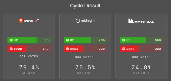 📡 检测到传输。 Brave Games:第一轮投票结果已出炉。 社区在第一轮投票中表现出色: 🦁 @brave 869 票 | 79.4% 余额 🔐 @MidnightNtwrk 934 票 | 75.5% 余额 🎮 @MythicalGames 880 票 | 74.8% 余额 势头正盛,策略正在酝酿。每一票都将继续影响最终结果。 第一轮投票仅仅是个开始。 谁将在下一轮胜出?