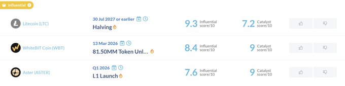 过去 24 小时内最具影响力的事件 📈 🥇 影响力评分 9.3/10,催化剂评分 7.2/10 $LTC (@ltcfoundation) 2027 年 7 月 30 日或更早 减半 👉 coinmarketcal.com/en/event/hal...… 🥈 影响力评分 8.4/10,催化剂评分 9.0/10 $WBT (@whitebit) 2026 年 3 月 13 日 8150 万代币解锁 👉 coinmarketcal.com/en/event/81-...… 🥉 影响力评分 7.6/10,催化剂评分 9.0/10 $ASTER (@aster_dex) 2026 年第一季度 L1 发布 👉 coinmarketcal.com/en/event/l1-...… 更多亮点 👉 coinmarketcal.com/en/highlight...