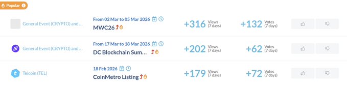 过去24小时内最热门的活动📈 🥇 +316 次浏览,+132 次投票 综合事件(加密货币) 2026年3月2日至3月5日 MWC26 👉 coinmarketcal.com/en/event/mwc...… 🥈 +202 次浏览,+62 票 综合事件(加密货币) 2026年3月17日至18日 DC区块链峰会 👉 coinmarketcal.com/en/event/tel...… 🥉 +179 次浏览,+72 票 $TEL (@ Telcoin) 2026年2月18日 CoinMetro 上架 👉 coinmarketcal.com/en/event/coi...… 更多精彩内容 👉 coinmarketcal.com/en/highlight...