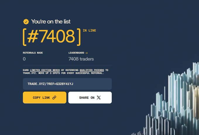 看到几个degen推去了解申请参与了下,1亿刀交易量的号申请排队到了7000多名。但好像是按照申请时间排队的。排队参与准则就是hyper上大于5m交易量,基本都是真实用户了,参与标准比较高,可能还可以,如果你在hype上交易量大于5m且想参与,我的邀请是:http:/trade.xyz/?ref=G328Y41YJ