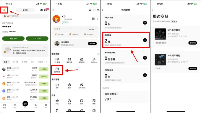 OKX 交易所又送周边了。 去年送的都还没穿,今年的又来了。门槛还是一样,仅限 VIP 用户可领,并限时 6 天提交~ 图一、领取入口: 打开 OKX 交易所,首页横幅第一个点进去,即可填写尺码地址等信息。 图二、查看周边详情: 交易所首页点击左上角,并在下方找到我的奖励,点击周边商品即可查看。