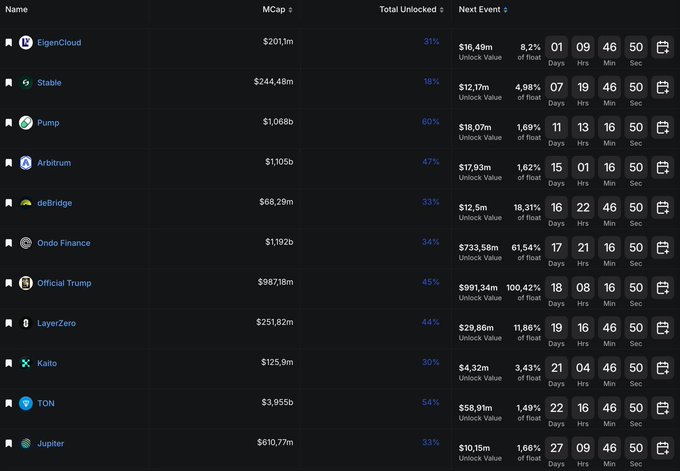 退出流动性即将面临考验💀 🔓 一月份代币解锁: 1月1日 - $EIGEN:1649万美元 1月7日 - $STABLE:1217万美元 1月11日 - $PUMP:1807万美元 1月14日 - ARB:1793万美元 1月16日 - $DBR:1250万美元 1月17日 - $ONDO:7.3358亿美元🚨 1月17日 - $TRUMP:2.5507亿美元🚨 1月19日 - $ZRO:2986万美元 1月20日 - twitter.com/AmirOrmu/status/20...
