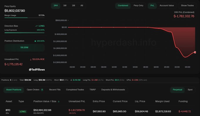 今天,一位巨鲸以 20 倍杠杆开立了 53,464,000 美元的多头头寸。 如果比特币下跌 10%,他将全部资产被清算。