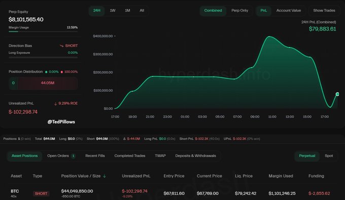 一头巨鲸以 40 倍杠杆开立了 44,000,000 美元的空头头寸。 清仓价:79,242 美元