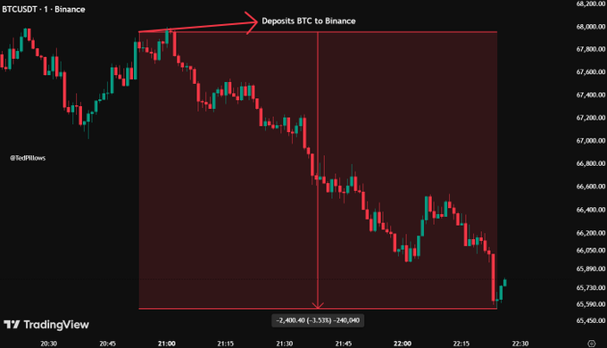 $BTC 在这位巨鲸开始向币安存入比特币后一小时内抛售了 2,400 美元。 命中率3/3。 twitter.com/TedPillows/status/...