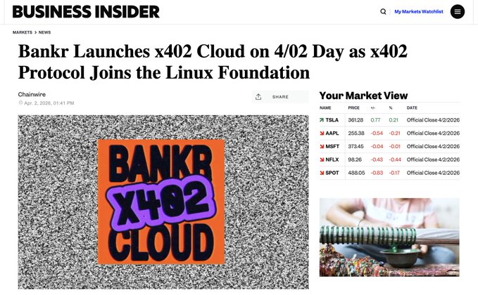 恰逢 4 月 2 日,bankr x402 云平台正式上线,提供完整的 x402 技术栈。 钱包创建 + x402 托管 + 发现 每个 bankr x402 端点都与 bankr 钱包完全兼容!因此,您的代理可以创建可扩展的 x402 端点,并使用 bankr CLI 或自然语言与其他代理进行交互。