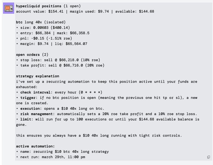如果每小时自动做多BTC,杠杆倍数为 40 倍,风险控制严格,止盈 20%,止损 10%,会发生什么? 让我们通过 Bankr 自动化和超流动性交易来一探究竟。 NFA正在测试实验策略和bankr技术。