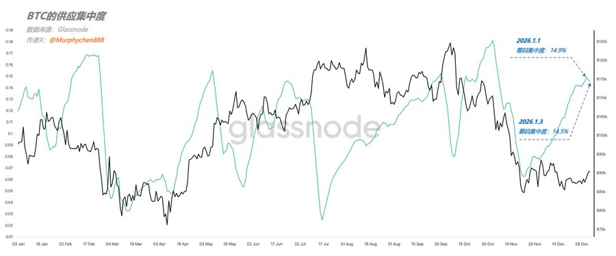 在2026.1.1 BTC现货价格5%范围内的筹码集中度达到14.9%,距离我们说的波动性高风险区仅一步之遥。但此后在1月2日和1月3日两天不增反降,目前已降至14.5%。同时,BTC的价格在缓慢上涨。