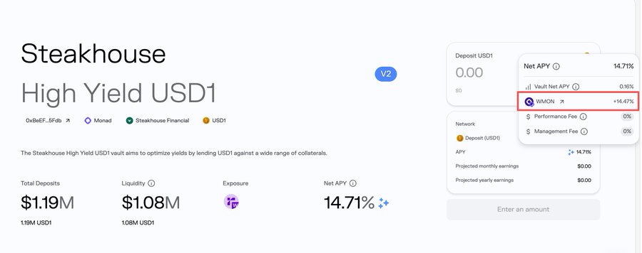 USD1 use cases, continued: → First @Morpho vault, live → First DeFi presence on @Monad → Curated by @SteakhouseFi → Built by @reservoir_xyz. That's a lot of firsts. 🦅☝️ x.com/reservoir_xyz/…