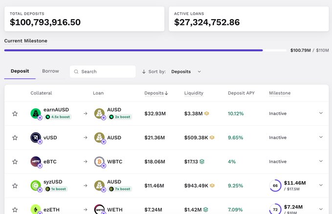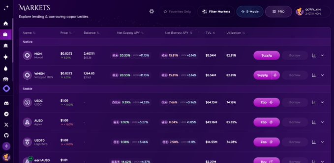 Monad最近刷到很多次了 $MON 的价格目前挺稳的,已经0.27了,比公售价格要高一丢丢,和同期的那些公售项目对比,我给到夯 curvance是Monad上的原生项目,也是原生项目中的最大的一个借贷协议,目前TVL突破了1亿美金,恭喜 @Curvance 刚开始,我在这里放了不少钱,因为收益真的很不错,现在的收益也不低 另外一个不错的原生借贷是 @Neverland_Money ,这个协议是 fork 的 AAVE,看到Monad社区的不少人在这里赚到了钱 希望Monad还能带来更多惊喜! twitter.com/0x_xifeng/status/2...