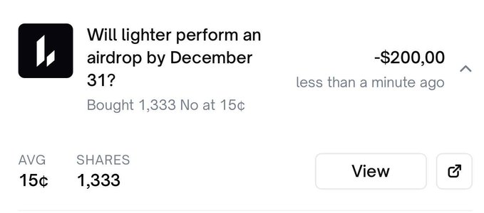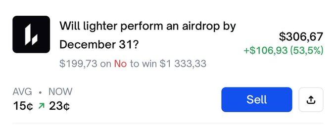 也许我傻,但我这是在逆市场而行。 抱歉,但作为一名建造者,我不相信新年之前两天会有 Lighter 空投。 市场糟透了,他们的购买力会很低。 团队也明白这一点,可能会试图通过在 Polymarket 交易平台上发布公告来赚钱。 但这完全是赌博,没有任何分析,只是凭感觉行事。 祝你好运:http:/polymarket.com/event/lig...… 附:我押注“否”,金额为 15 美分(接近 7 倍)。