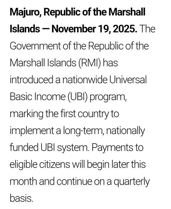 突发新闻:马绍尔群岛成为首个推出全民基本收入计划的国家。每位居民(约3.3万人)将每三个月领取200美元。这相当于人均GDP的11%左右。如果美国也采用同样的比例,那么全民基本收入将约为每月770美元。
