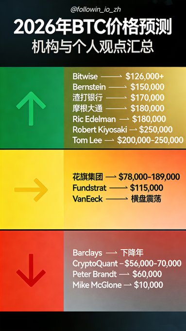 最新!2026年 $BTC 价格预测来了! 今年的最后一天,我专门帮大家整理了各大机构和分析师对明年BTC价格的观点,建议收藏起来! 🔥看多派 1️⃣Bitwise Investments,超过12.6万美元 2026年会继续上涨,甚至创下新高。 主要原因,当前BTC波动率趋于稳定,而且四年周期已死,传统周期力量减弱。