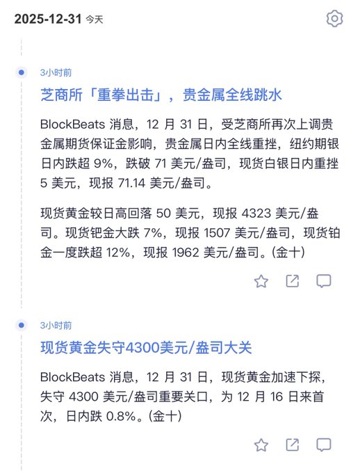 🚨昨夜Crypto爆点信息合集,1分种Get市场焦点丨12/30 1⃣ #BTC、#ETH、#SOl 持续画门,流动性低到令人发指,美股指数全面下跌,科技股乏力,情况就是这么个情况~ 2⃣黄金和白银期货双双下滑,其中白银暴跌8.7%,创近五年来最大单日跌幅。回调了~ 3⃣易理华旗下Trend Research单日增持超4.6万枚ETH,