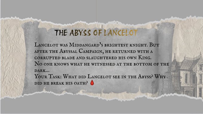 ⚔️档案员日志:第二周⚔️ 主题:兰斯洛特的深渊 兰斯洛特是米丹加德最杰出的骑士。但在深渊战役之后,他带着一把被腐化的剑返回,并弑君自尽。 无人知晓他在黑暗深处目睹了什么…… 兰斯洛特在深渊中究竟看到了什么?他为何违背誓言?🩸