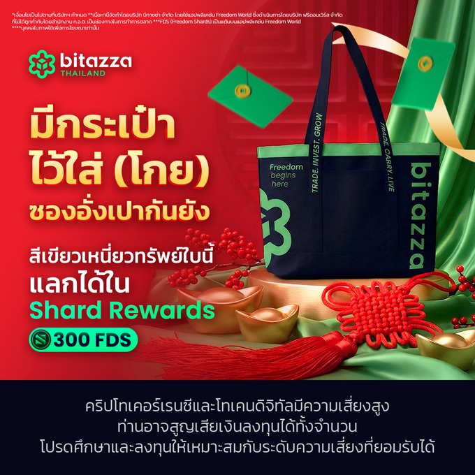 🎊 春节大吉,快来大赚一笔吧!🧧 这款幸运绿色 Bitazza 手提袋空间超大,可以装下好多红包!💚🎉 只需在 Freedom World 应用的碎片奖励中消耗 300 个自由碎片即可兑换。如果积分不够,还可以通过完成 Bitazza Thailand 的任务来积累更多。 查看所有奖品:freedom.world/freedom/shop 🚀 立即前往以下链接积累更多 FDS:bitazza.onelink.me/AGAP/5d129a...