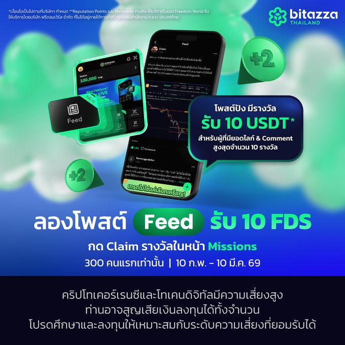 🔥 发帖赢大奖! 首先在 Bitazza Feed 上发布您的第一条帖子。 Bitazza Feed 是专为交易者打造的应用内社区。 🎁 参与特别活动: 1️⃣ 首帖奖励:获得 10 FDS(前 300 名在“任务”页面领取奖励的用户) 2️⃣ 互动量最高:获得 10 USDT(共 10 名获奖者)。获奖者将根据互动量评选,综合考虑点赞数和积极建设性评论的数量。 📅 2026 年 2 月 10 日至 3 月 10 日