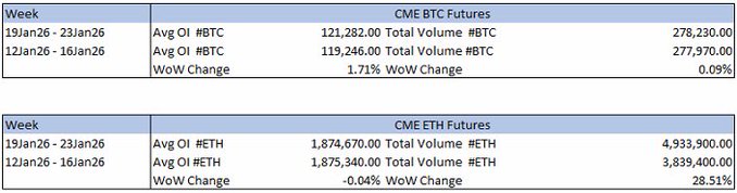 2026年1月19日至23日 #CMEWeekly [1/2] CME $BTC 期货 平均未平仓合约:121,282 BTC OI Chg% WoW:+1.71% 📈 魔兽世界交易量:+0.09% 📈 [2/2] CME $ETH 期货 平均未平仓合约:1,874,670 ETH OI Chg% WoW:-0.04% 📉 魔兽世界交易量:+28.51% 📈