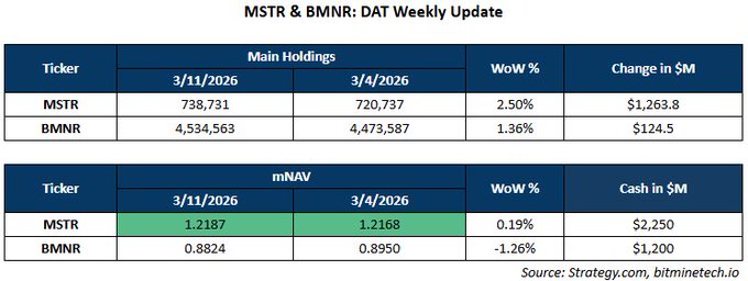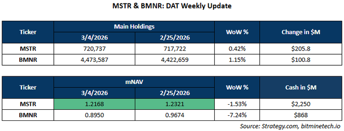 DAT每周更新 $MSTR 主要持仓:720,737 $BTC 平均净值:1.2168 $BMNR 主要持仓:4,473,587 $ETH 平均净值:0.8950