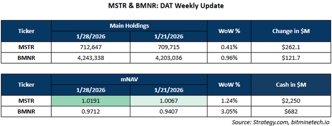 DAT每周更新 $MSTR 主要持仓:712,647 $BTC 平均净值:1.0191 $BMNR 主要持仓:4,243,338 $ETH 平均净值:0.9712