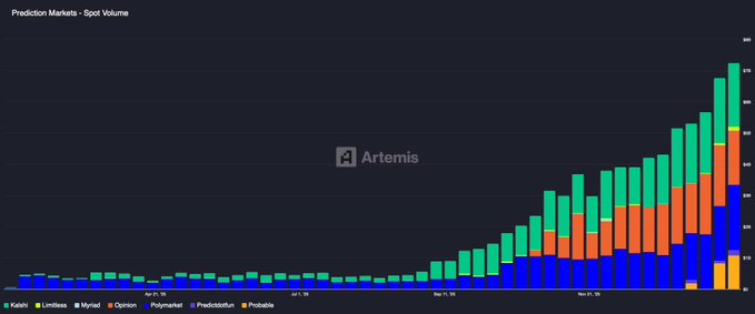 预测市场正成为目前加密货币领域最强劲的叙事之一。 周成交量连续第七周创下历史高点,而且丝毫没有放缓的迹象。 人们不再仅仅想交易加密货币……他们还想交易信息。