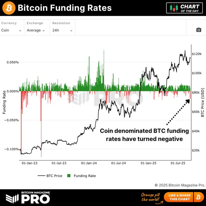 🚨 以比特币计价的融资利率再次变为负值!🚨 各大交易所的平均永续融资利率已降至 3 月份以来的最低水平,这表明大量交易者正在做空BTC!📉 他们会被证明是正确的吗?👇
