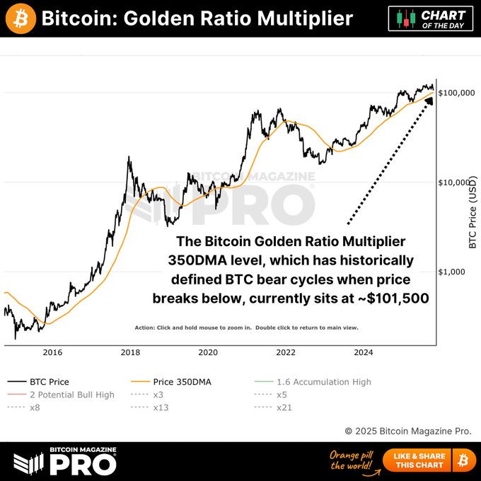 🐂 比特币黄金比例乘数 350 日均线 (DMA) 一直是BTC牛市和熊市之间的分水岭!🐻 目前价格约为 101,500 美元,并且每天都在上涨。不久的将来,我们会再次测试甚至突破这个价格吗?🫣 让我知道👇