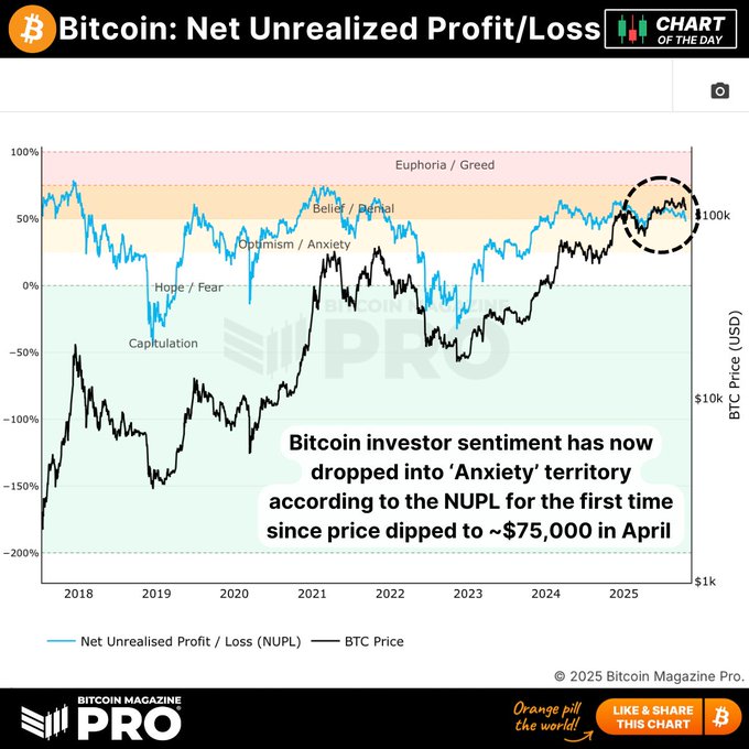 自 4 月BTC跌至约 75,000 美元以来,比特币净未实现盈亏 (NUPL) 首次跌入令人焦虑的境地! 📉 投资人的焦虑情绪是否是逆向投资的好机会? 🤔 让我知道你的想法:👇