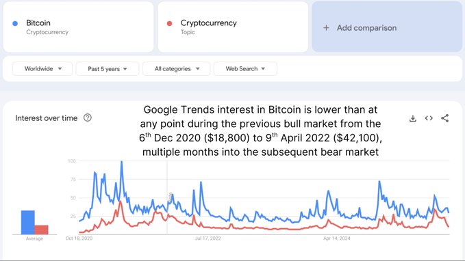 尽管比特币价格维持在 10 万美元以上,机构投资者的采用率也创下历史新高,但散户的兴趣却大幅下降。 目前,Google上「比特币」的搜寻量几乎低于整个 2020/21 年牛市以及随后的熊市。 详细分析如下: