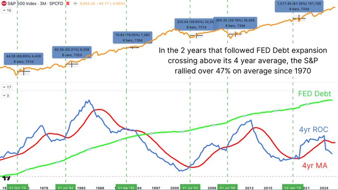 自1970年以来,联准会每次债务扩张超过其四年平均值都会推动资产上涨,标准普尔500指数在正向交叉后的两年内平均上涨了47%! 如果/当流动性再次扩张时,比特币和硬资产将受益最大。 完整分析请见我的文章(连结如下):