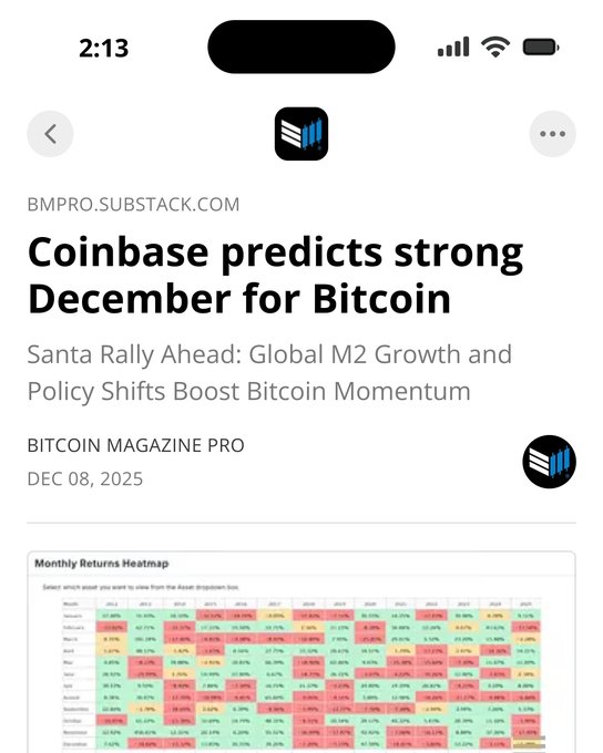 Coinbase 看好BTC在 12 月的趋势!随著流动性增加、联准会可能降息以及卖方压力缓解,圣诞节行情或将到来。 ETF 也将反弹! 🚀 👉 在这里获取您的每周Alpha:open.substack.com/pub/bmpro/p/...… 👀