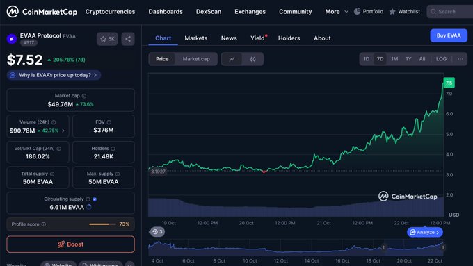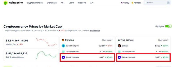 $EVAA 再次回归 CoinGecko 趋势 🦎 coingecko.com/en/coins/evaa-pr...… 隔夜上涨 46%,使 $EVAA 成为涨幅最大的股票,并且仍在持续上涨。