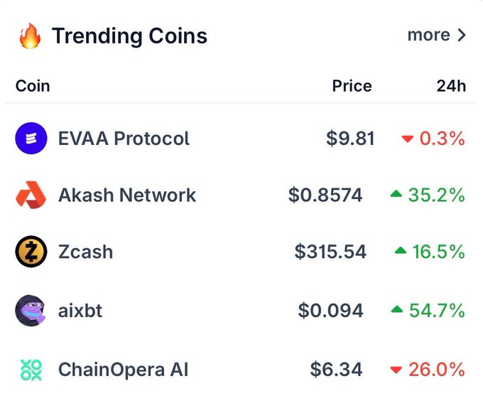 过去 24 小时内最热门的 6 种代币是 $EVAA、$COAI 和 $ ZEC。