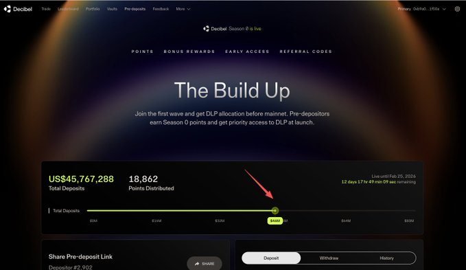早期 Alpha 项目 Decibel 目前处于 Pre-Deposit 预存阶段 才一天时间已存入 4700 万美金,8000 万美金封顶,2 月 25 日截止,还剩 12 天。 存款链接🔗 app.decibel.trade/r/evaeva 这次预存不是简单存钱等空投,而是用时间加权积分机制提前锁定主网上线优先权。越早存、放得越久,权重越高,早期小仓位甚至可能比后期大额更有优势。现在参与可以锁定 Season 0 积分、USDC 计价奖励资格、主网 Beta 优先体验权,以及优先进入 DLP(核心流动性池)的机会,越早参与越好。 说下策略:可以用主号拉小号,可以赚取推荐10% AMP 收益,可以做点低保号,最低是50U的存款。等主网上线后,到时候还有两级邀请的收益。 不要觉得Decibel @DecibelTrade 是另外一个Perp DEX,现在Perp DEX确实挺多,这么多里面不可能每个都跑出来,最后还是要看它的产品有没有自己的护城河,所以得看底层架构和流动性结构设计能力。 Decibel 的团队背景很强,Decibel 本身是由 Decibel Foundation 开发,而且得到了 Aptos Labs 强力支持,核心成员来自 Aptos 核心开发、Meta 和高盛,团队里面的人懂底层区块链架构也有传统金融风控背景,而且它卡的也是 Aptos 的核心生态位。 所以它在产品的定位上,本质是在做一个全链上交易引擎。现货、永续、多资产保证金、流动性金库整合在统一平台,撮合和执行全部在链上完成,不走“链下撮合+链上结算”的混合模式。 技术上它深度集成 Aptos 的 Block-STM 并行架构,在 Move VM 基础上优化 Trading VM,实现全链上 CLOB 撮合、连续资金费率和多资产跨保证金账户(APT、USDC、BTC、ETH、SOL 等),追求高并发低延迟。同时基于 Aptos 原生 X-Chain 账户支持跨链入金,可以从 Aptos、ETH、Solana 甚至 CEX 直接参与,用 USDC 存入,不是单链生态孤岛模式。 相比很多靠补贴驱动的 Perp DEX,Decibel 更强调底层技术、开放度和安全性,这也是它和多数项目拉开差距的地方。