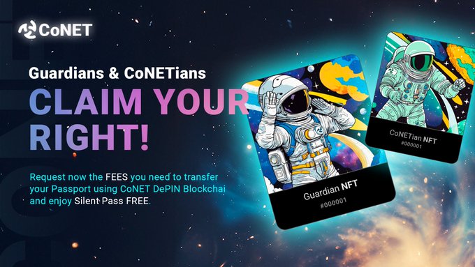 🎉 注意守护者和CoNET网络成员! 你现在可以在CoNET网络上领取$ETH作为使用静默通行证的奖励! 这笔$ETH可以用于支付将你的静默通行证护照NFT从CoNET平台转移到你的静默通行证钱包时的gas费用 — 解锁免费访问