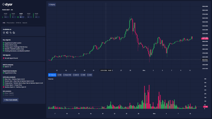 $PAXG 看涨趋势明显 🟡 趋势评分 34 + 看涨的超级趋势/MACD + Marubozu + 移动平均线堆叠 = 逢低买入设置 关键支撑位:4,950-5,000 美元(超级趋势/布林带中点/基准线)。 突破 5,100 美元将打开通往下一个斐波那契扩展区域(约 5,250 美元)的空间 📈