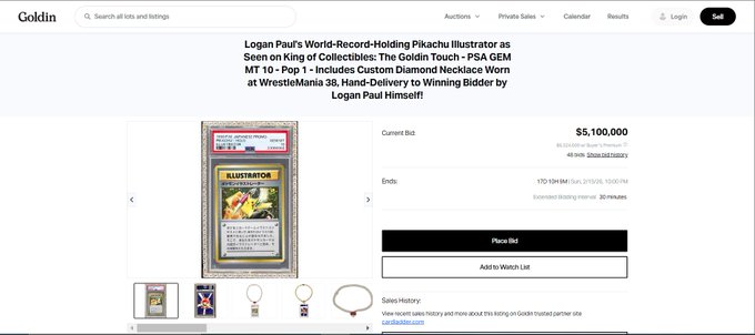 @LoganPaul 的皮卡丘插画作品在 @GoldinCo 上的成交价已达 510 万美元。 有趣的不仅仅是这个数字,更重要的是这笔交易对收藏品行业的影响。