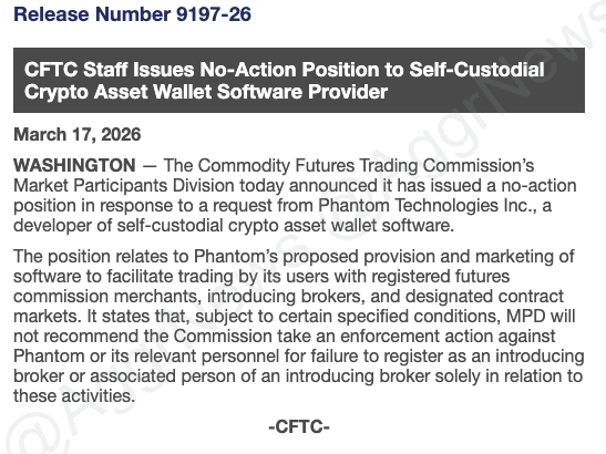 美国商品期货交易委员会(CFTC)不会要求 Phantom 注册为自管证券经纪商:网站 https://t.co/QaNRCNcj1q