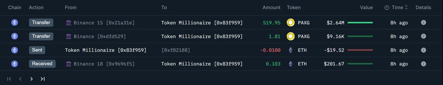 - 与单一实体关联的 2 个钱包「0x83F」和「0xd95」从 #Binance 提取了 986 $PAXG ($5.015M)。