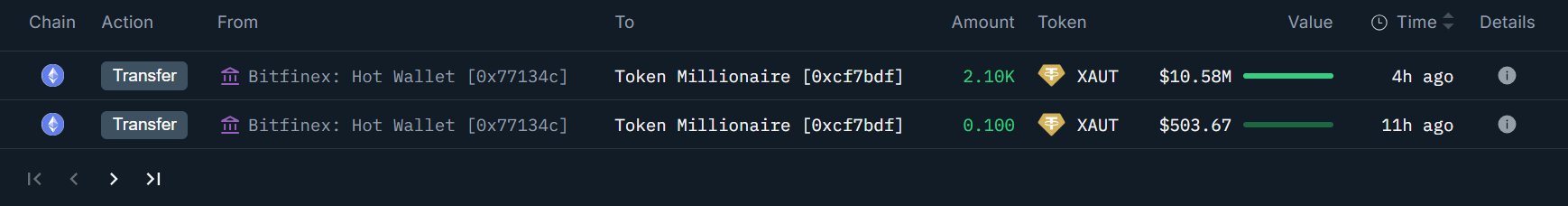 - 新建立的钱包「0xcF7」从Bitfinex收到 2,100 $XAUT ($10.58M)。