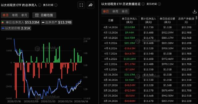 以太坊现货 ETF 昨日总净流入 5303.29 万美元,持续 4 日净流入