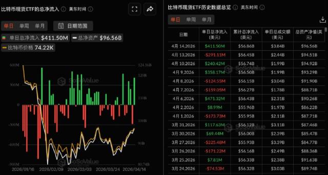 比特币现货 ETF 昨日总净流入 4.11 亿美元,贝莱德 IBIT净流入 2.14 亿美元居首