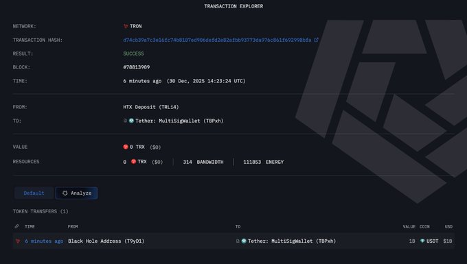 1,000,000,000 美元 $USDT 刚刚在TRON上铸造
