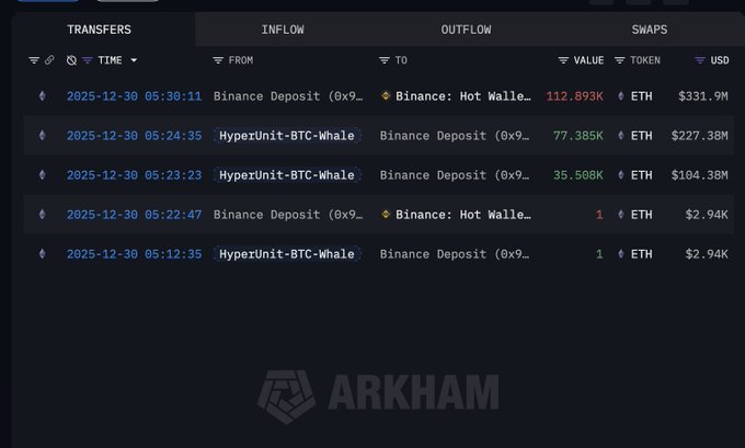 Hyperunit 巨鲸今天向币安存入了 112K $ETH ($3.31亿美元)。