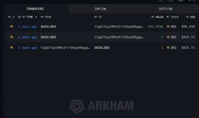 有人刚刚取消了 202K $ZEC (约 1 亿美元) 的屏蔽 约占流通中Zcash的 1.2%。