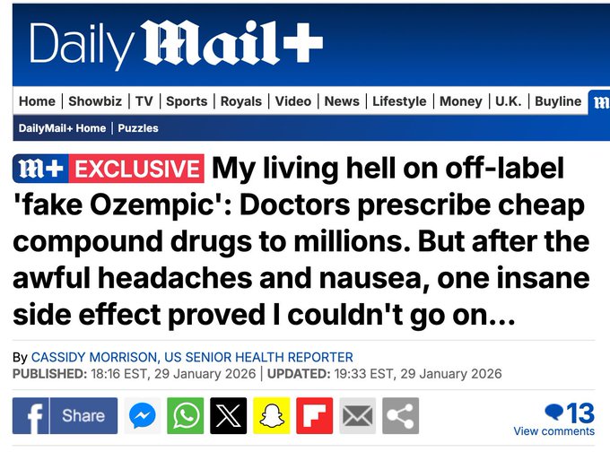 My living hell on off-label 'fake Ozempic': Doctors prescribe cheap compound drugs to millions. But after the awful headaches and nausea, one insane side effect proved I couldn't go on... https://trib.al/X1myKAY